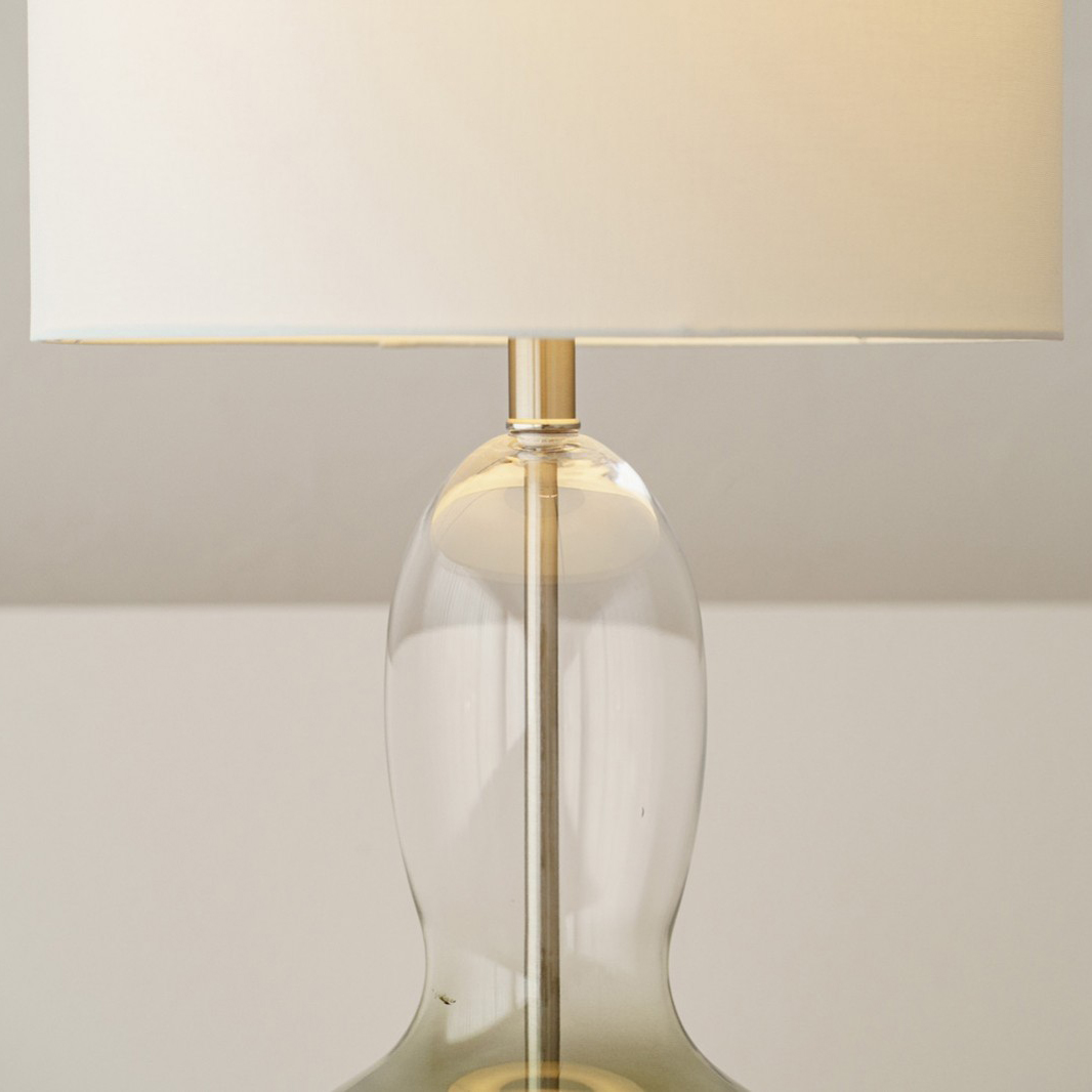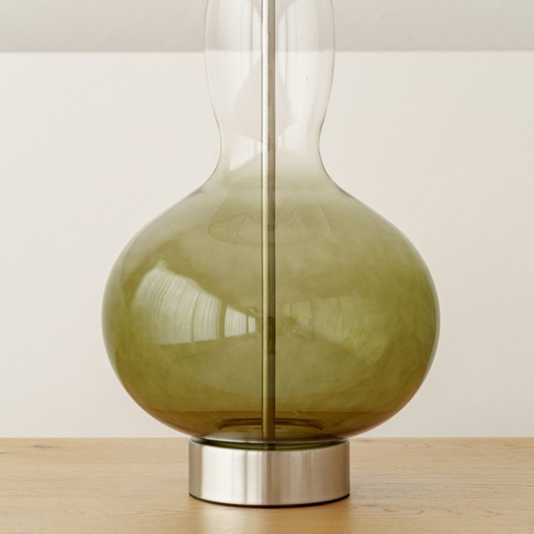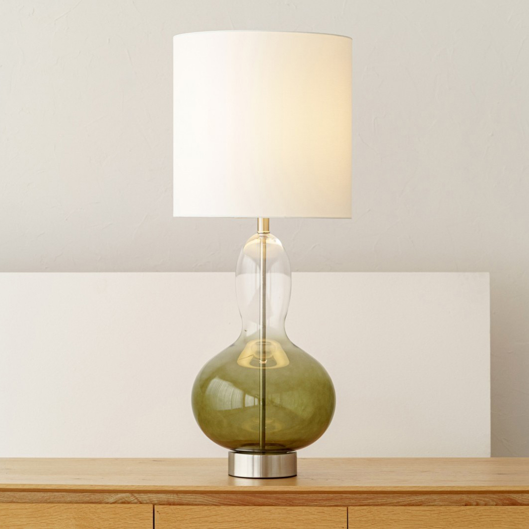 Lámpara de mesa Mae. Lámpara de líneas redondeadas realizada en vidrio en tono verde oscuro que se va difuminando desde la base hasta la parte superior de la lámpara. Base en metal con acabado níquel mate. La pantalla cilíndrica está realizada en lino blanco. Medidas base: 31x31x64 cm – Medidas de la pantalla: 38x38x38 cm
