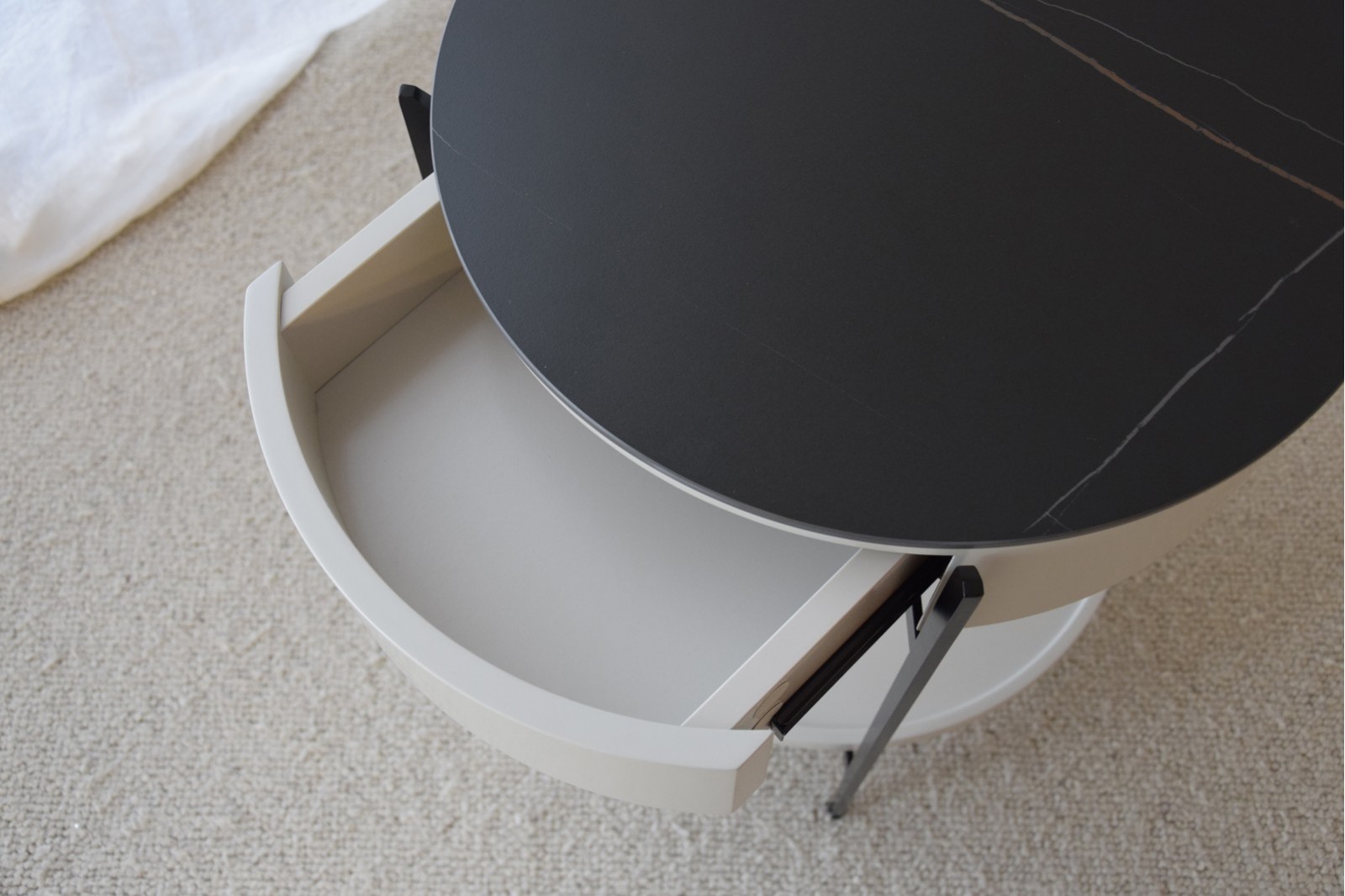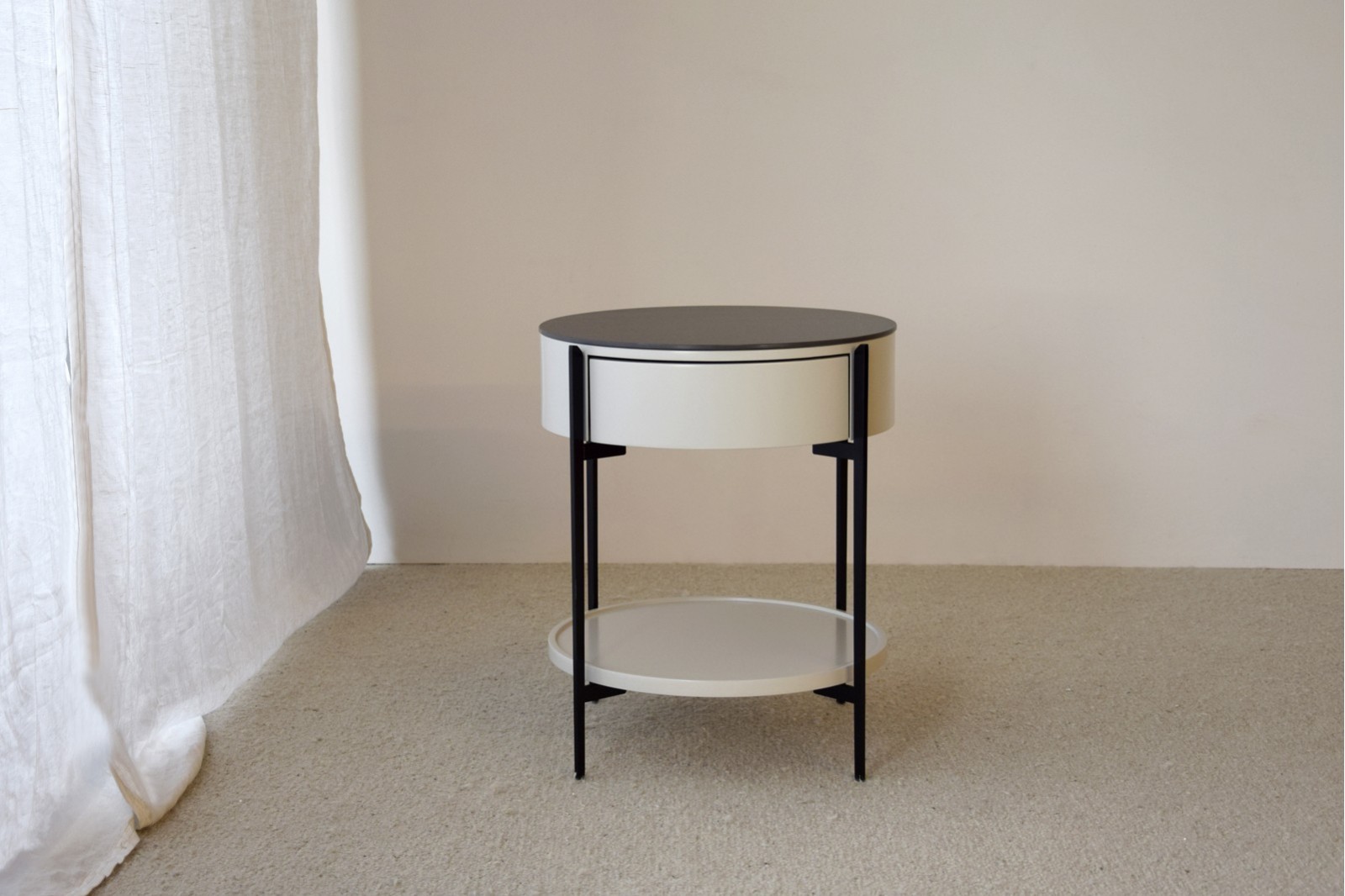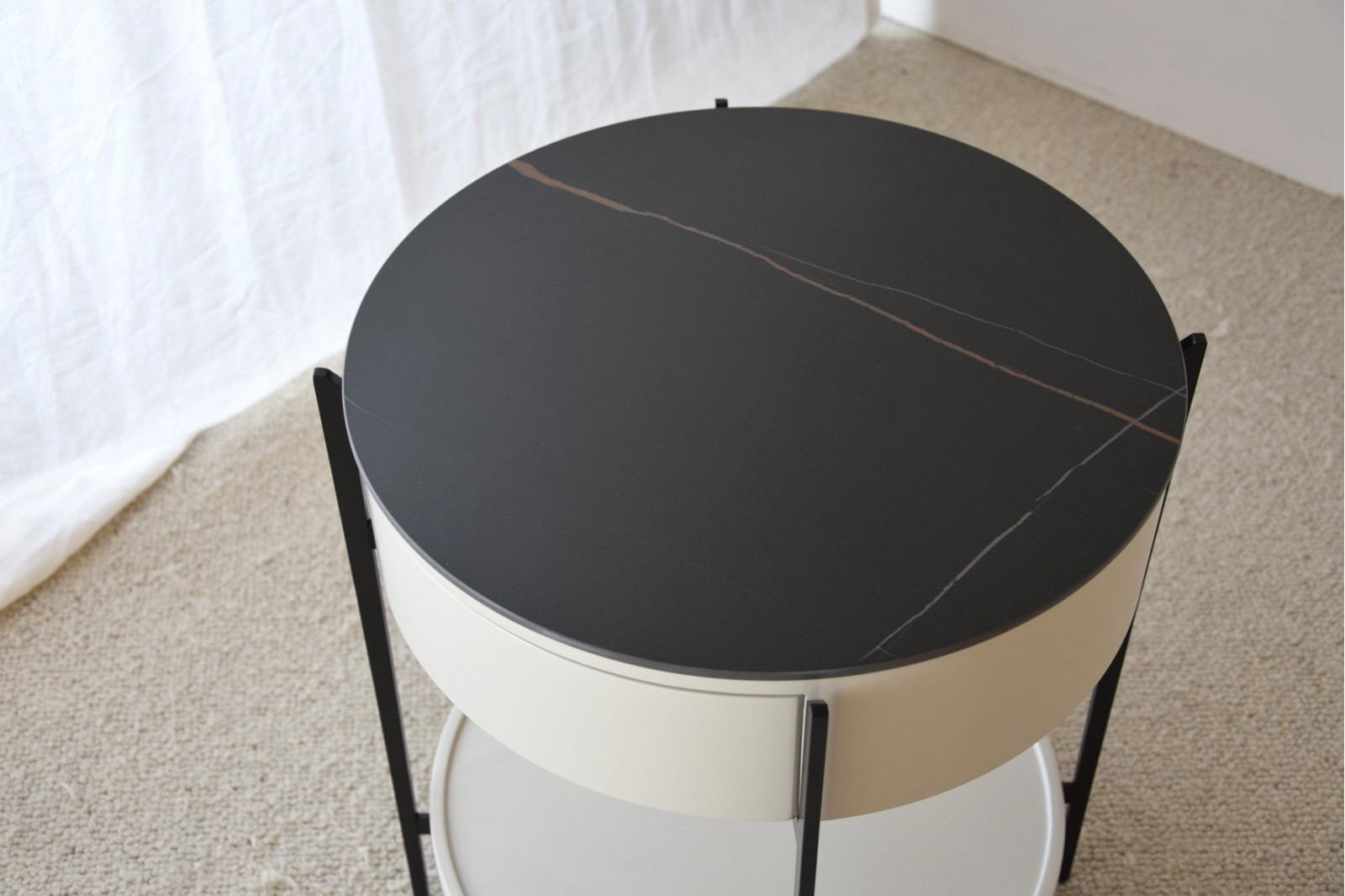 Mesa auxiliar de líneas redondas, esta mesa está formada por una estructura metálica en color negro con acabado mate y tablero en piedra sinterizada de color negro con vetas en tonos ocres de acabado también mate. El cuerpo de la mesa está realizado en dm lacado en un tono gris arena con acabado mate. Cuenta con un práctico cajón y un estante inferior. Requiere montaje. Limpieza con paño seco.