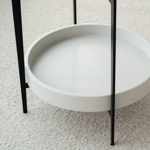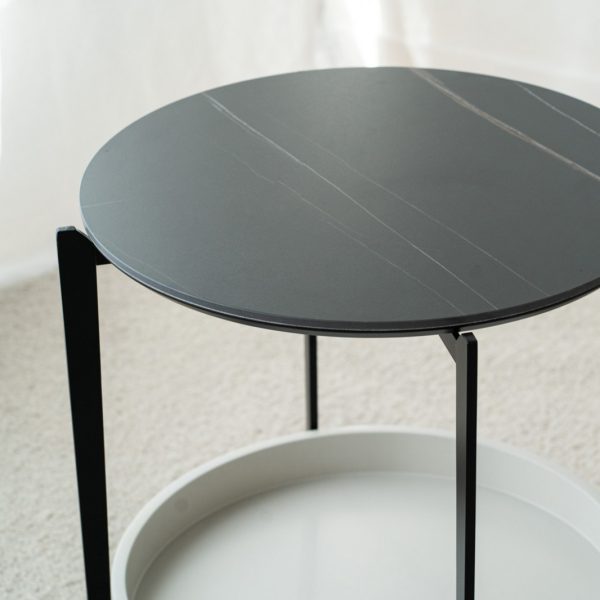 Mesa auxiliar redonda con pata en metal negro mate y sobre en mármol cerámico en negro mate con vetas ocres. Bandeja inferior dm lacado en color mate gris arena.