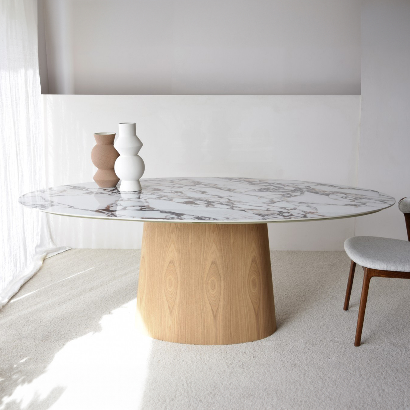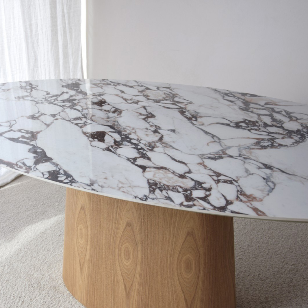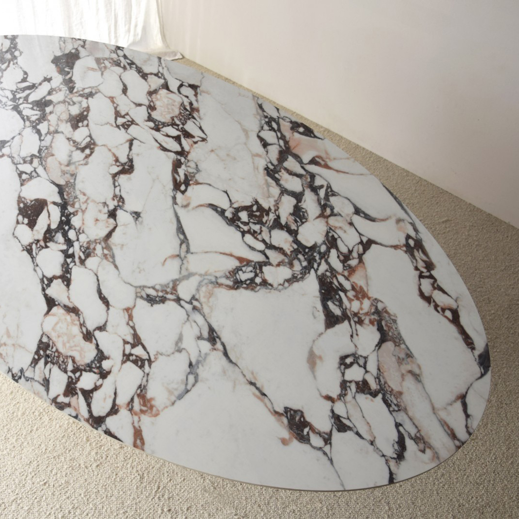 Mesa comedor oval con parte superior en material cerámico acabado mármol con un dibujo en distintas tonalidades marrón violeta rojo sobre fondo blanco acabado brillo. La base de la mesa tambien de sección ovalada decrece desde la parte inferior a la superior. Diseño contemporaneo y tranquilo capaz de adaptarse a diversos estilos. Los tonos y patrones del material utilizado en el sobre pueden ser diferentes de unas piezas a otras.