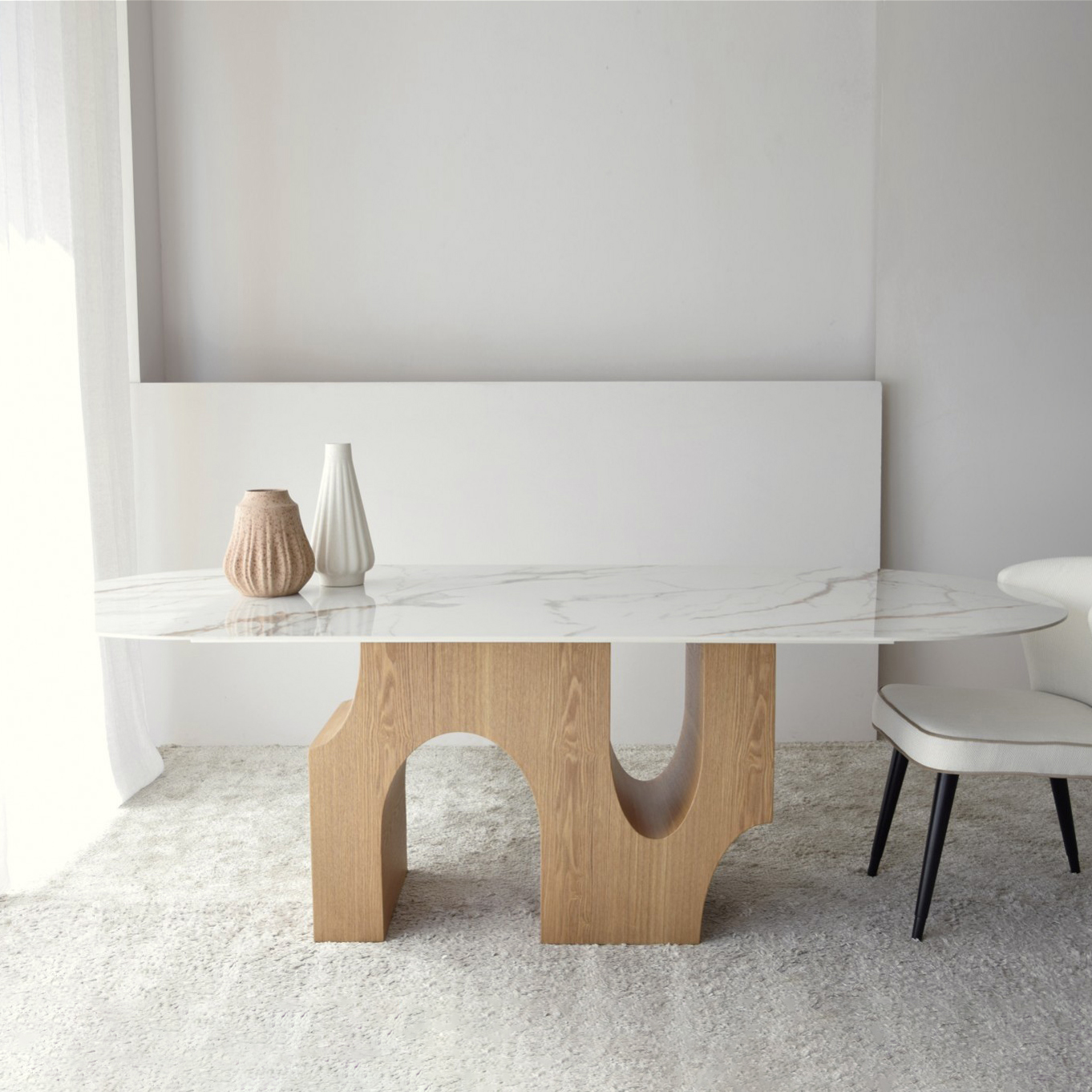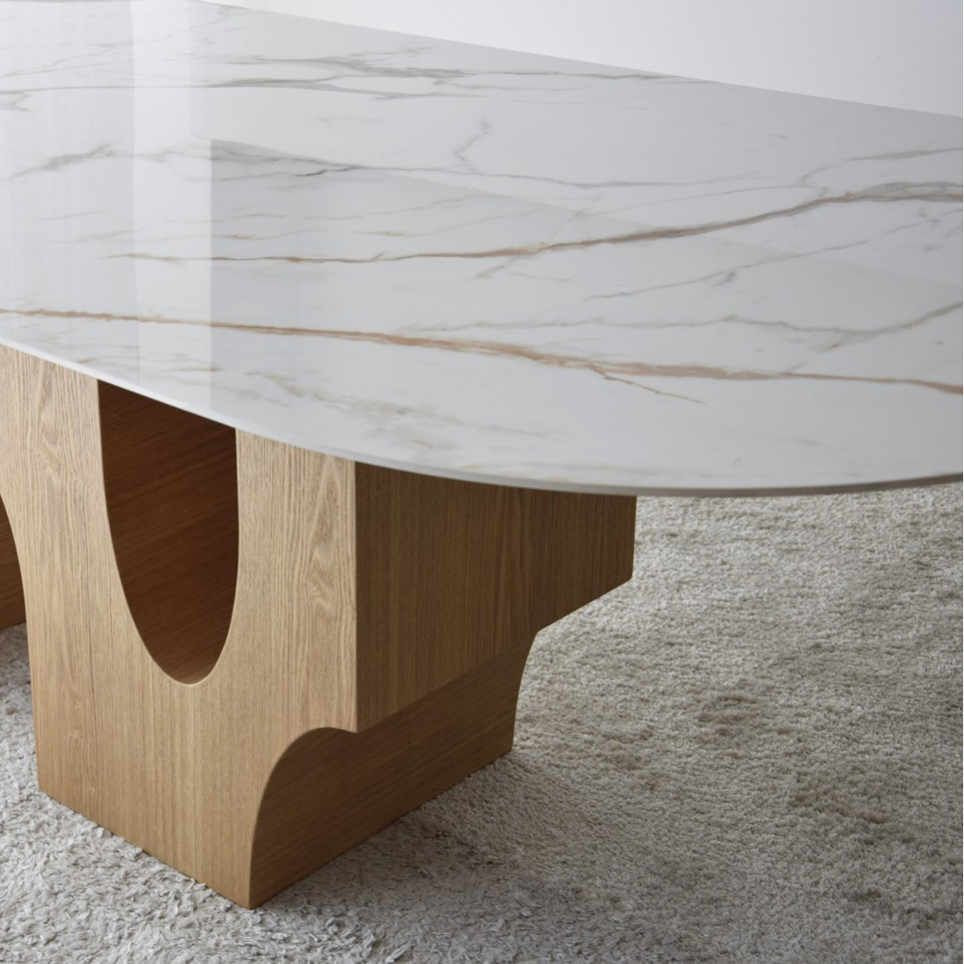 Mesa de comedor Petra con sobre realizado en material cerámico de 12 mm de espesor de acabado mármol en color blanco veteado en tonos ocres y grises. La base está formada por una pieza de diseño escultórico a la que aporta gran ligereza el vacío de los huecos que la atraviesan. Realizada en dm rechapado en fresno natural de acabado mate. Los tonos y patrones del material utilizado en el sobre pueden ser diferentes de unas piezas a otras.