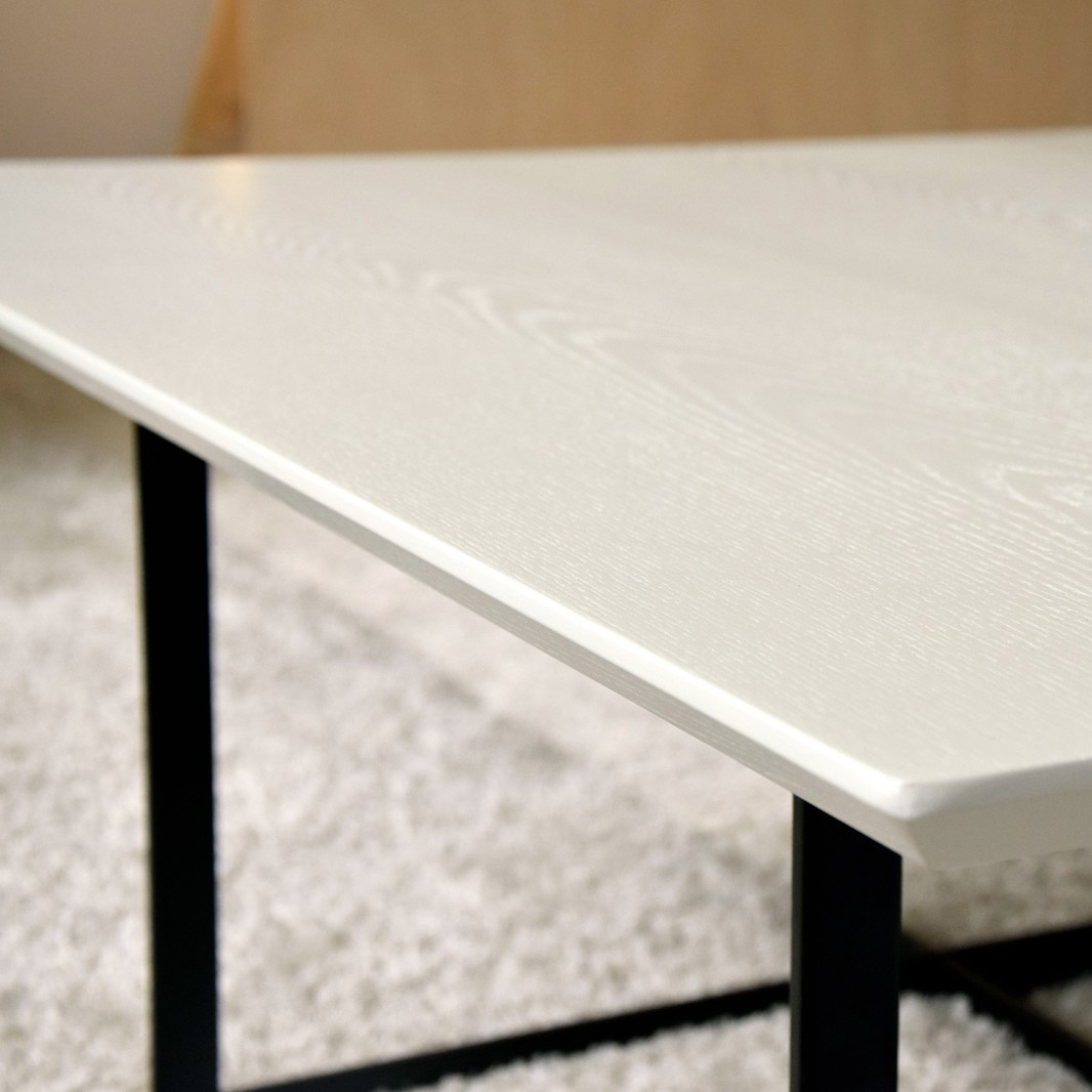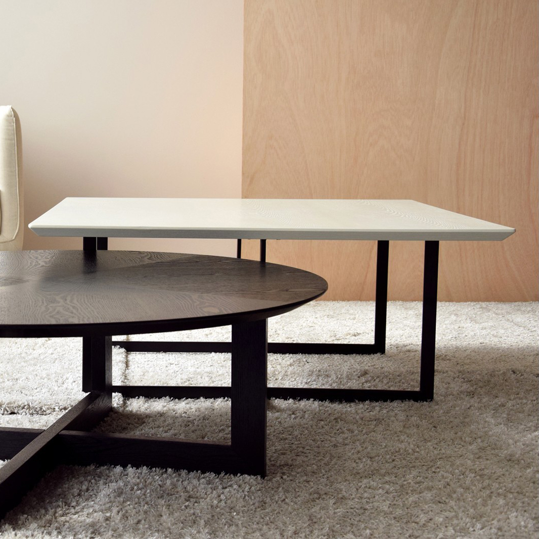 Mesa de centro cuadrada. Sobre realizado en tablero de dm rechapado en madera fresno natural teñido en un tono blanco roto mate que deja a la vista la veta natural de la madera. Patas en hierro negro mate.