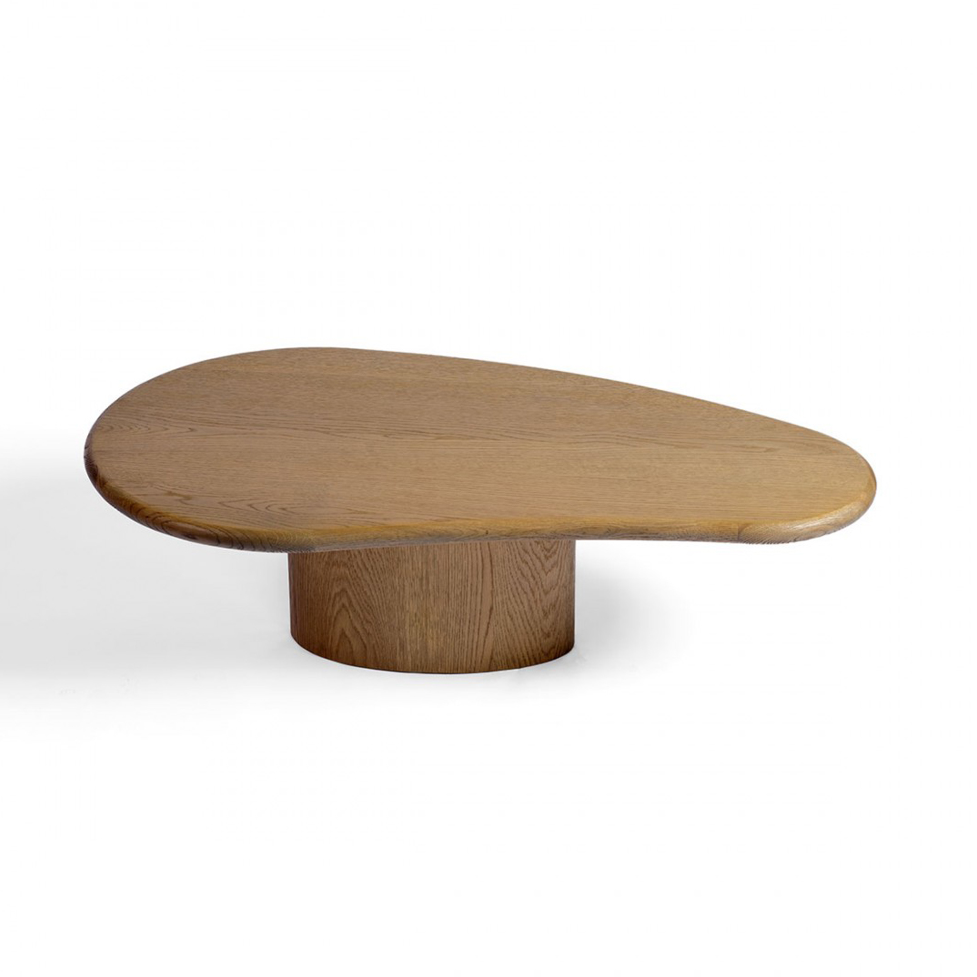 Mesa de centro de madera de roble natural con forma irregular y pata central. Diseño con líneas curvas sofisticado y elegante. Se puede usar en set con otros modelos y medidas. Se venden por separado.