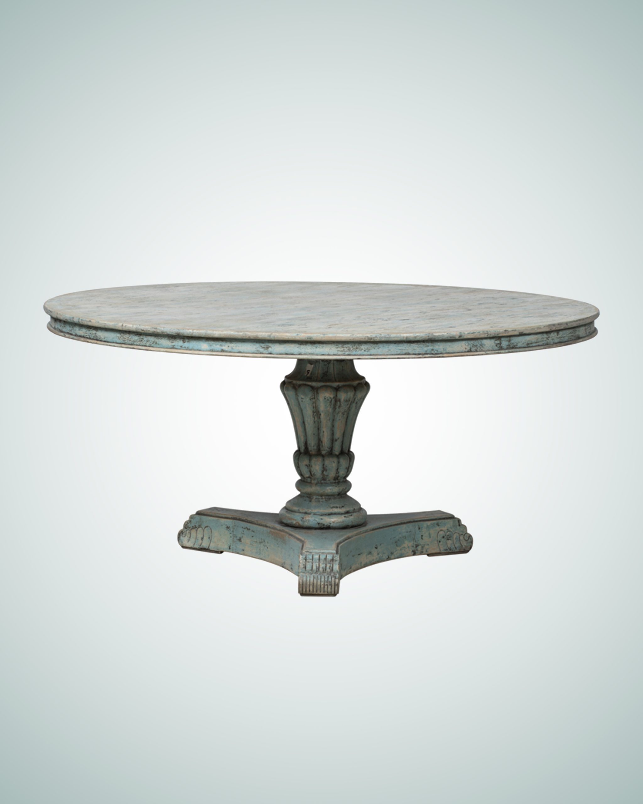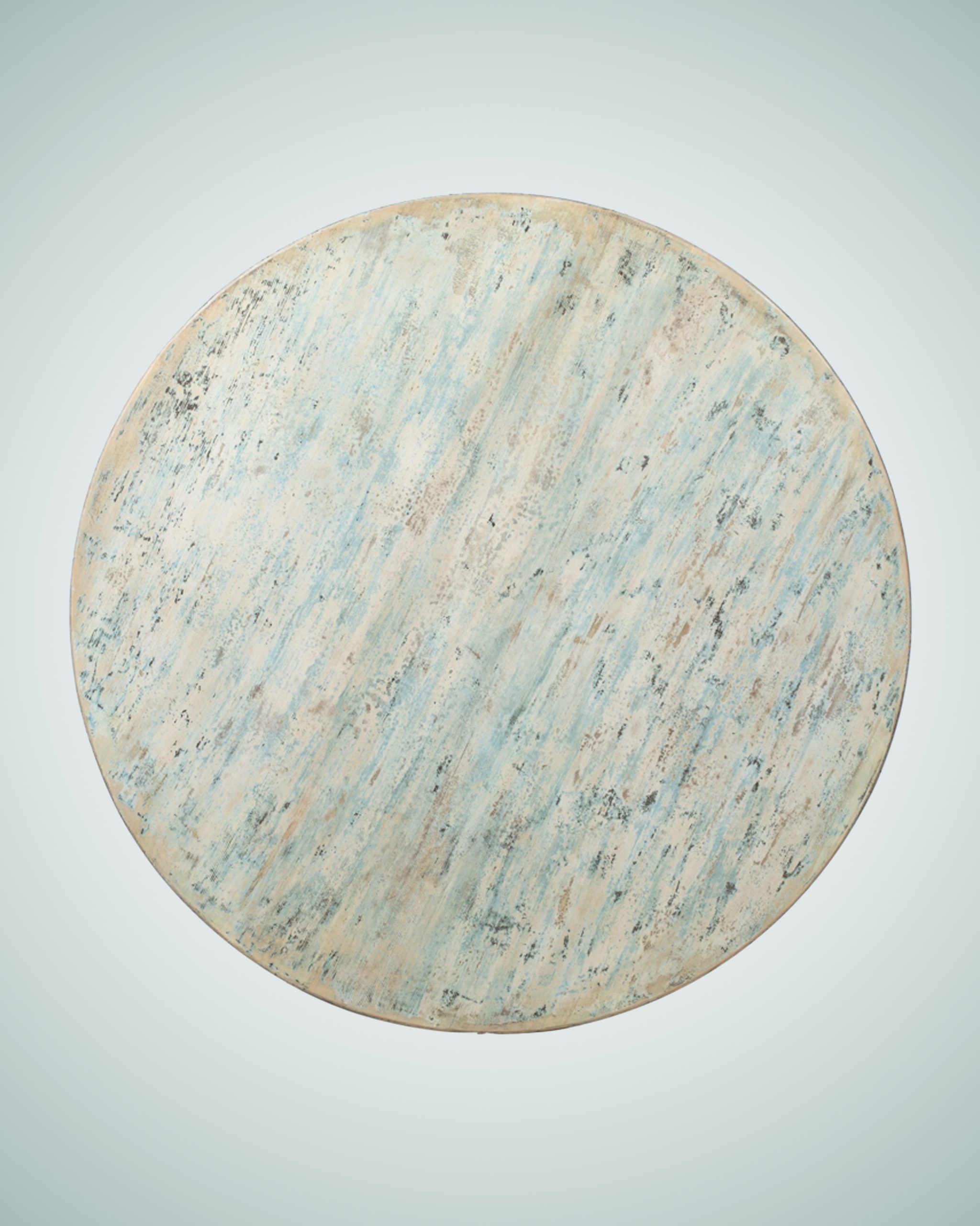 Mesa de comedor redonda con patina en color azul. Esta realizada en madera de pino y la procedencia es asiática. Tiene un peso total de 142 Kg.