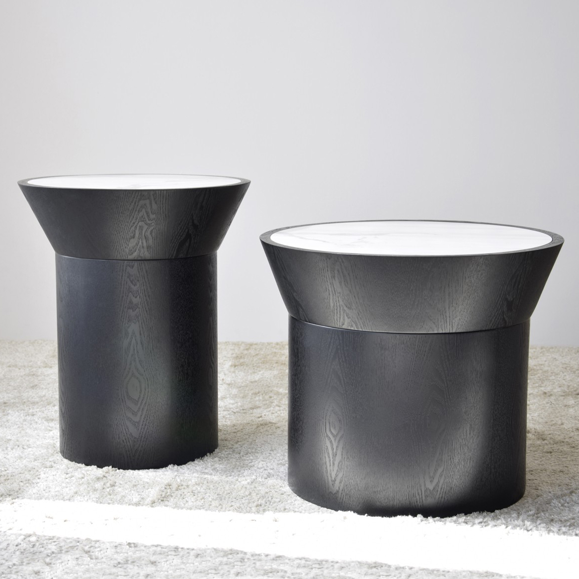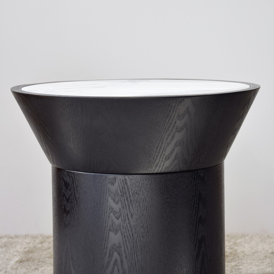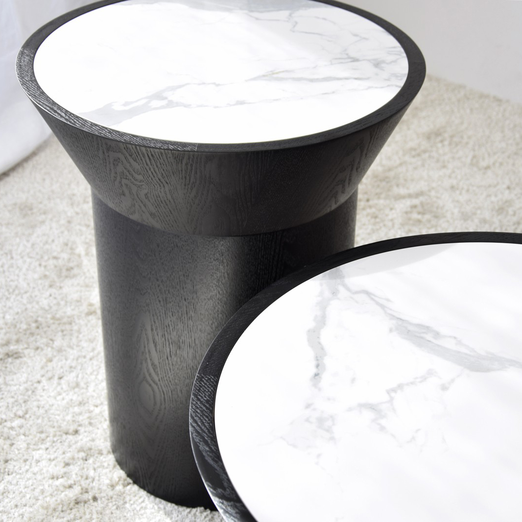 Mesas auxiliares de diseño cilíndrico. Sobre encastrado realizado en material cerámico de 5.5 mm de espesor con acabado mármol en color blanco veteado en gris. La estructura está realizada en dm rechapado en madera de fresno natural teñido en negro mate. Los tonos y patrones del material cerámico pueden ser diferentes en cada pieza.