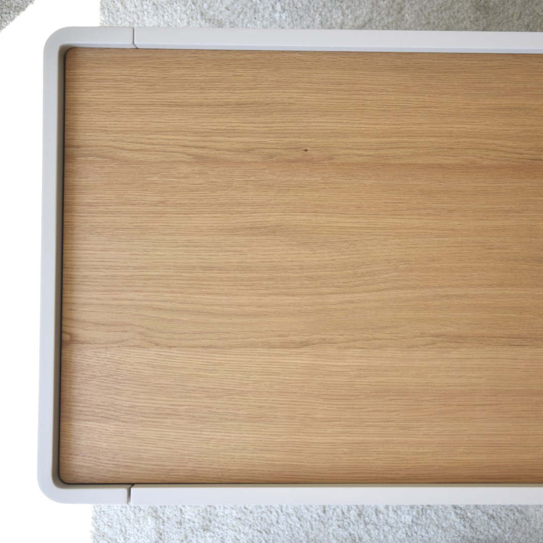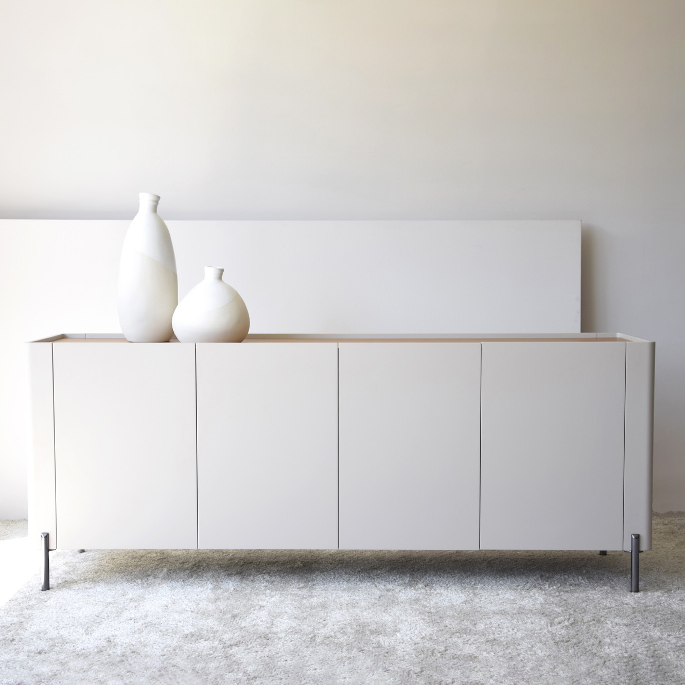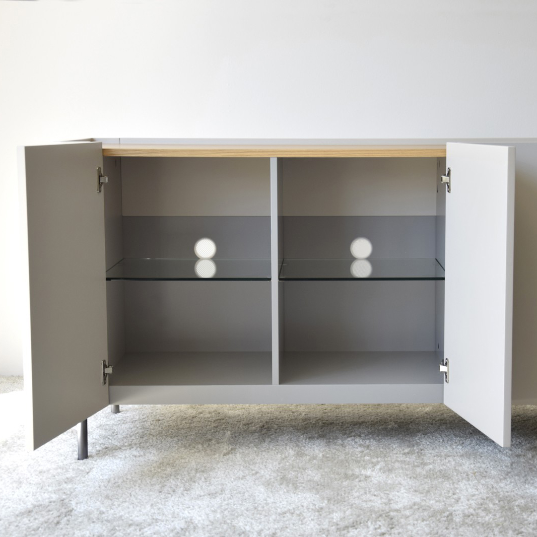 Aparador realizado en dm lacado en tono gris arena con acabado mate y parte superior rechapado en madera de roble natural. Pieza de mobiliario de lineas suaves y sinuosas con bordes redondeados y diseño atemporal capaz de tener un papel protagonista en los interiores desde la cocina hasta la sala de estar la entrada y la zona de noche. La combinacion del lacado mate con la madera de robleda como resultado una pieza de mobiliario cálido y contemporáneo. Las patas de niquel oscuro están integradas en el diseño aportando un grado de sofisticacion al mueble. El cuerpo principal esta formado por 4 puertas y baldas de vidrio templado transparente en el interior.