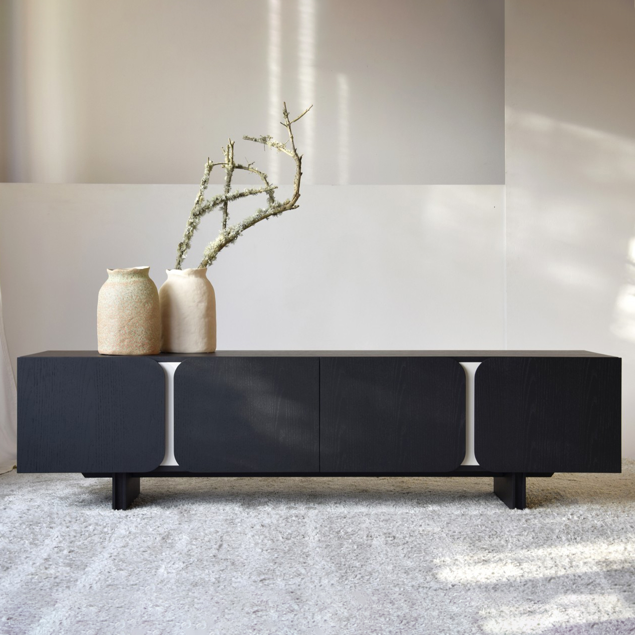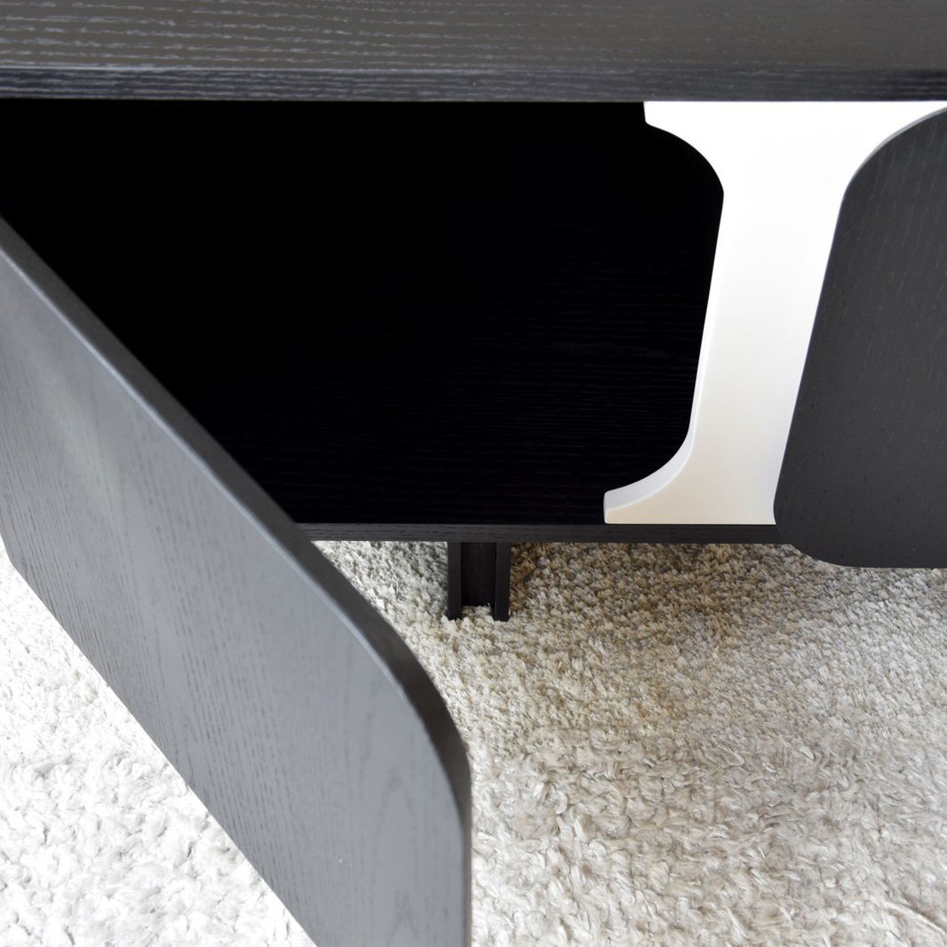 Mueble tv colección Curva. Mueble realizado en dm rechapado en roble natural teñido en negro de acabado mate. Detalles lacados en tono gris arena mate. 4 puertas. Limpiar con un paño seco. No utilizar productos abrasivos. Requiere montaje.