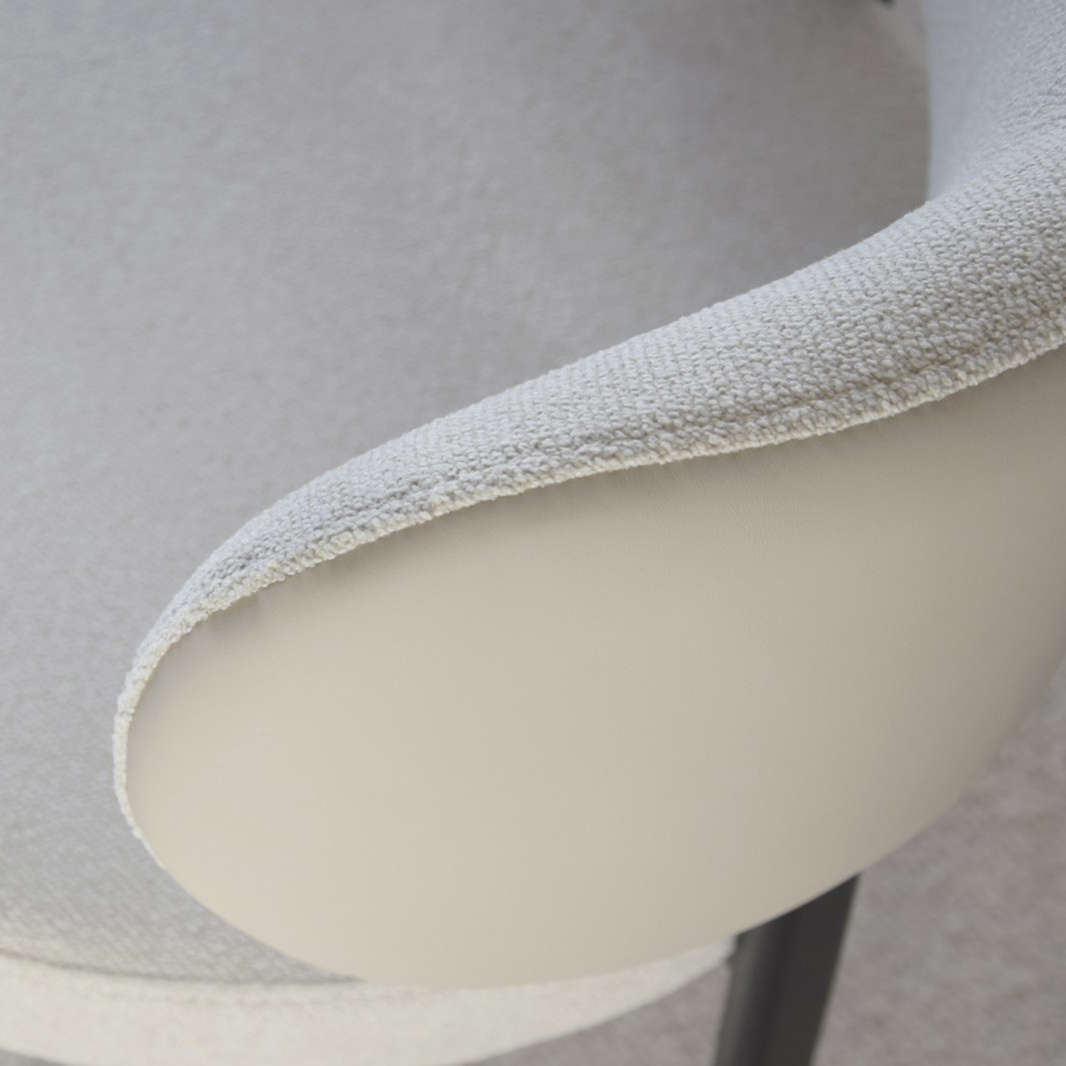 Silla de comedor con brazos en tono blanco roto y gris arena. Se trata de una silla de diseño muy actual y urbano de formas redondeadas y confortables que combina un tejido con textura en color blanco roto junto con una trasera del respaldo en piel sintetica en color gris arena. Se trata de una estructura metálica de una sola pieza lo que aporta estabilidad y resistencia. Patas metálicas lacadas al horno en color negro mate. Altura asiento: 45cm. No requiere montaje. Solo limpieza profesional.
