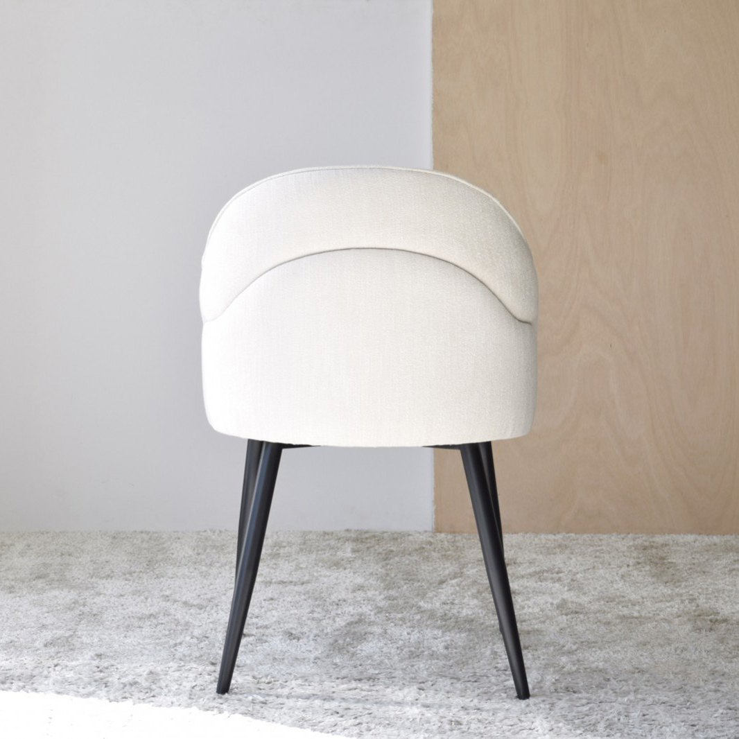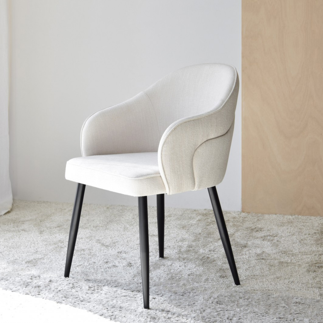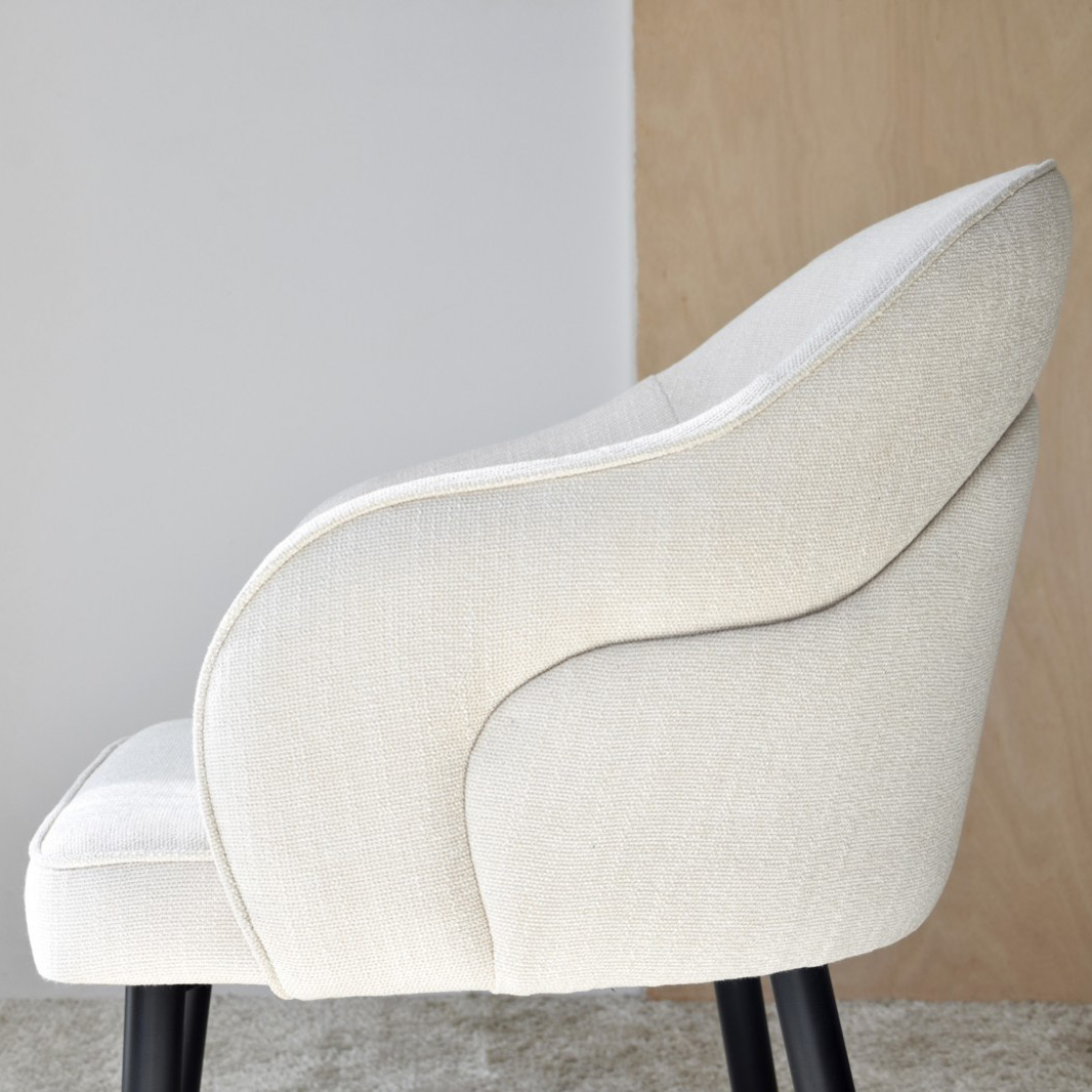 Silla de comedor con brazos colección Roma. Tapizadas en un tejido con textura de tono beige esta silla destaca por su diseño de líneas sinuosas que se enfatizan con la costura realizada en la trasera que reproduce la línea curva marcada por el respaldo. Sus formas suaves y envolventes invitan a tomar asiento y disfrutar de largas sobremesas. Pata metálica en negro mate. Altura del asiento: 47cm. Altura del reposabrazos: 68cm. Tapizado: 100% poliéster.