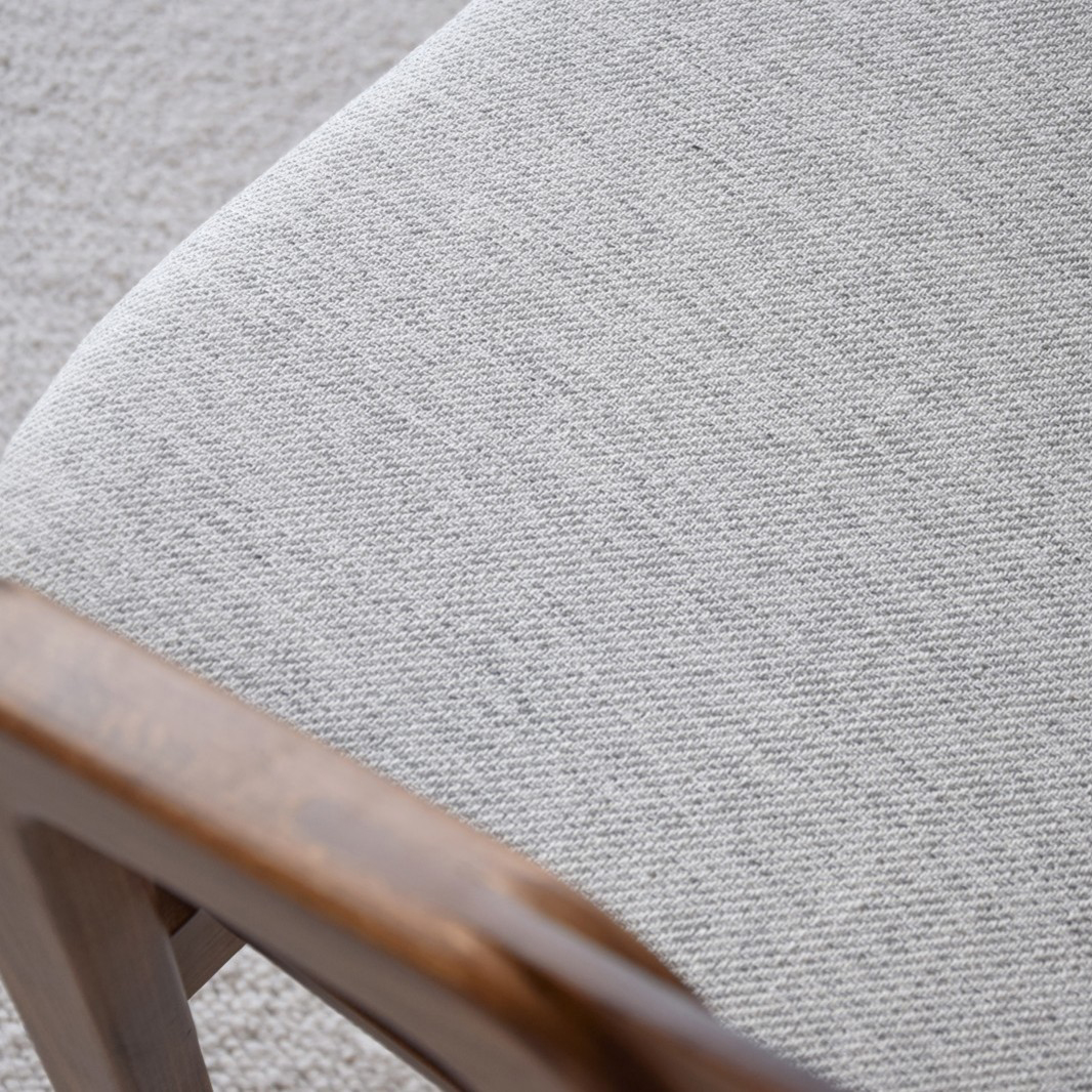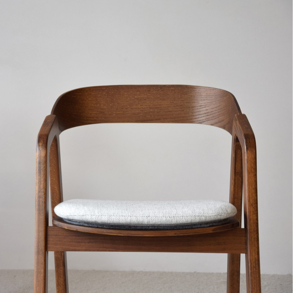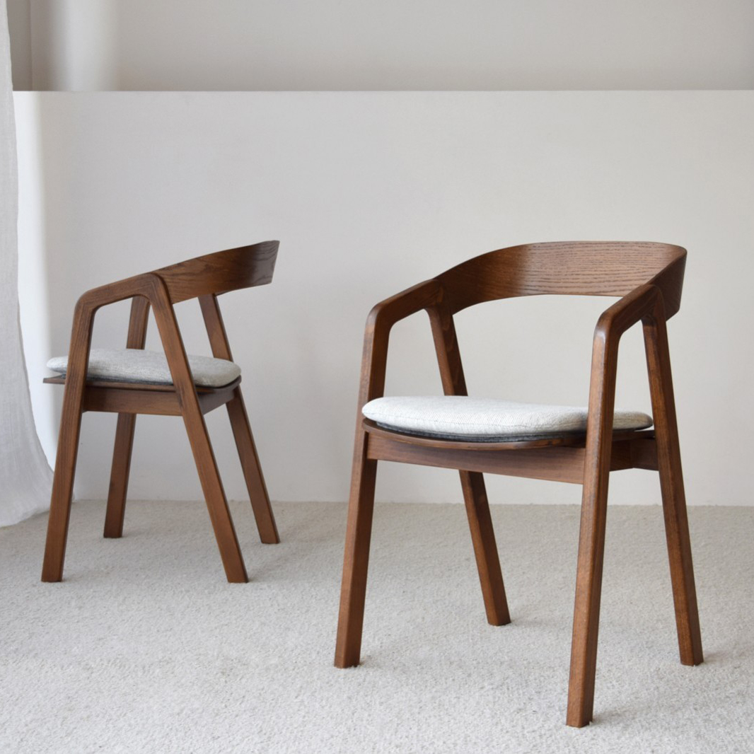 Silla de comedor realizadas en madera maciza de roble y acabado barnizado en color castaño. Tanto el asiento como el respaldo están realizados en tablero contrachado de fresno haciendo destacar las vetas propias de la madera. Diseño contámporáneo que da respuesta a las necesidades de comodidad y tendencia en decoración. Se ha añadido un cojín removible en mezclilla blanco gris. Altura de asiento: 47 cm medida asiento: 48×48 cm Altura total 80 cm.
