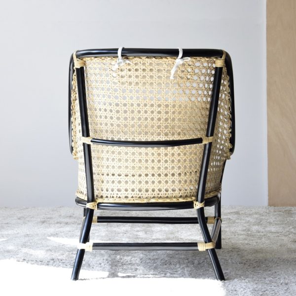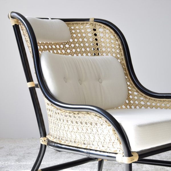 Medidas: 71 x 89 x 90 cm Sillón Elena fabricado en rattan color negro y natural. Incluye cojín en tono crema de tejido 100% algodón. Altura del asiento 42cm. Uso exclusivo interior.